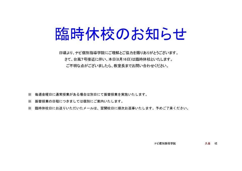 ナビ個別指導学院久喜校では安全面を考慮して本日3限(18:30-19:50)以降の授業を休講とさせていただきます。