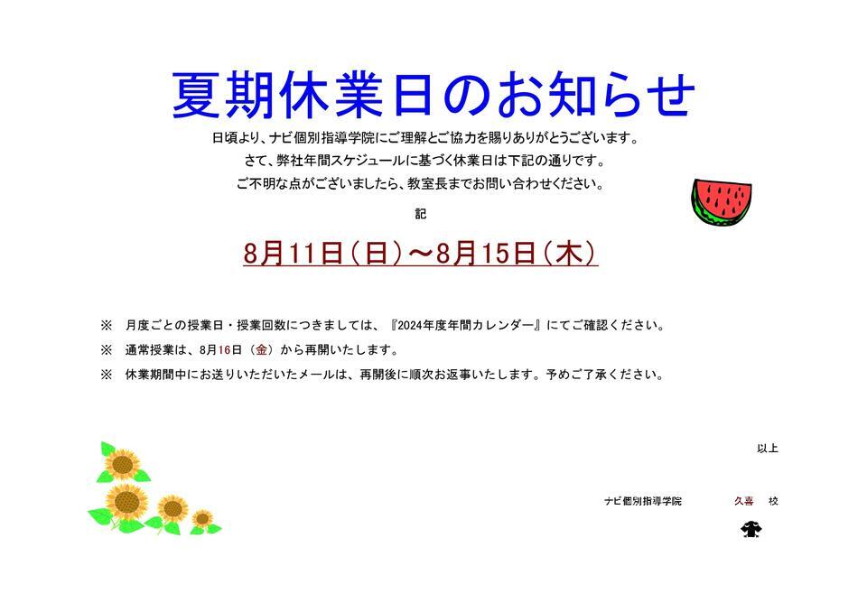 ナビ個別指導学院久喜校は【 2024/08/11㈰~2024/08/15㈭ 】の期間にてお休みをいただきます。