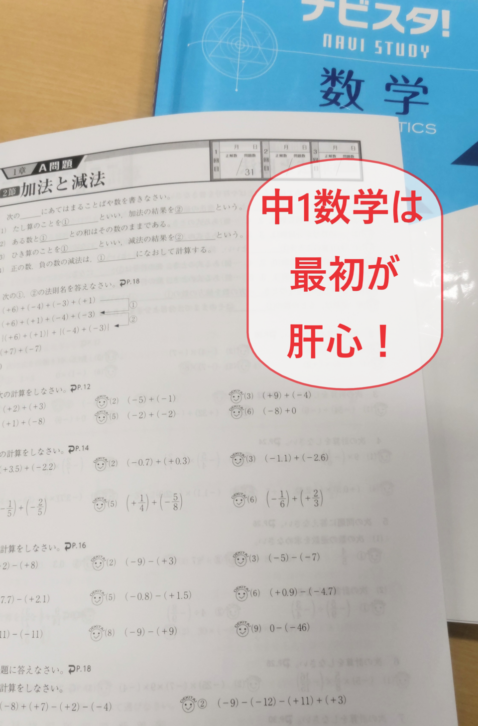 その中でも数学で最初に学習する「正負の数」については、最初のテスト(6月上旬)までにしっかり身に付けなければいけません。