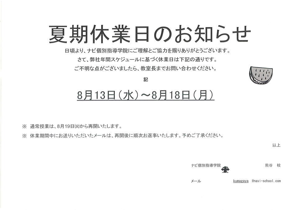 上記期間で頂いたご連絡につきましては、8月19日㈫以降にお返事させて頂きますので、ご理解のほどよろしくお願い致します。