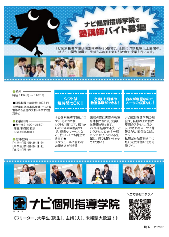 細かい募集要項はナビ個別のHPの一番下にある「塾講師採用情報」からご覧になって頂きたいと思います。