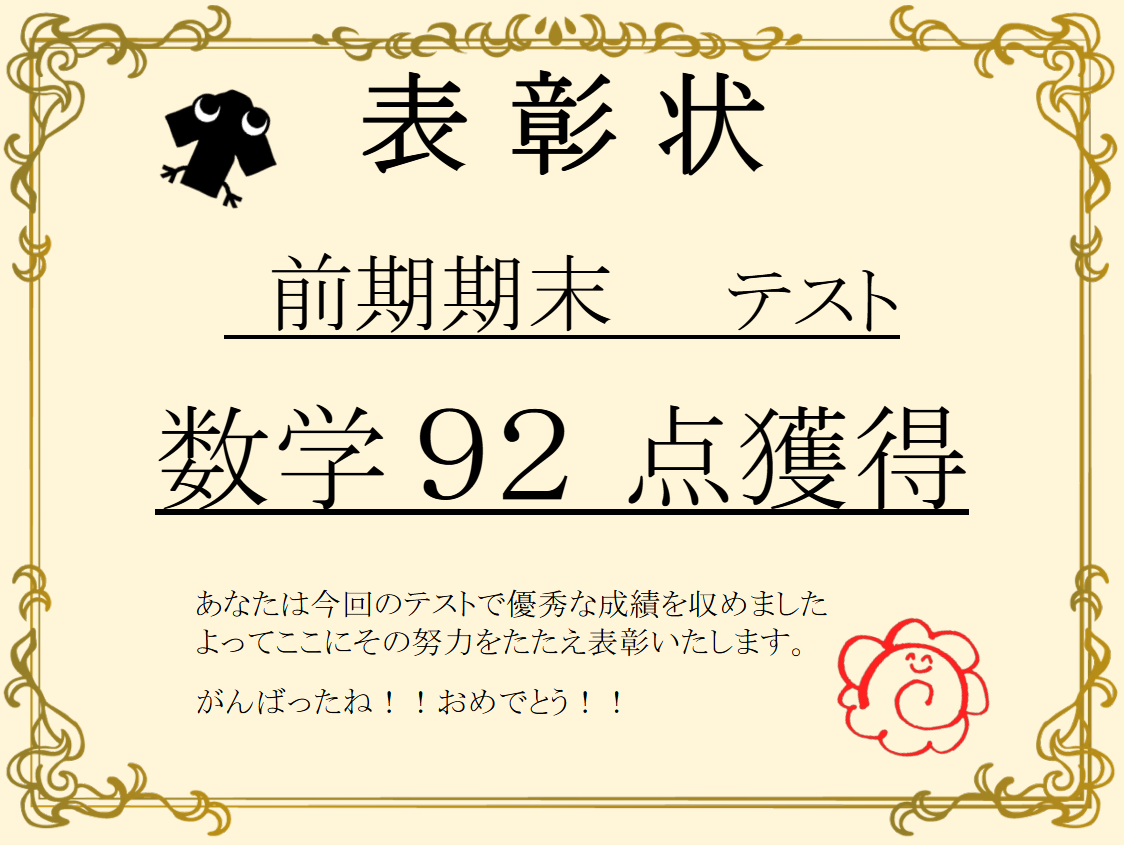 中2前期期末テスト数学得点:92点 クラス順位1位! よくがんばりました!