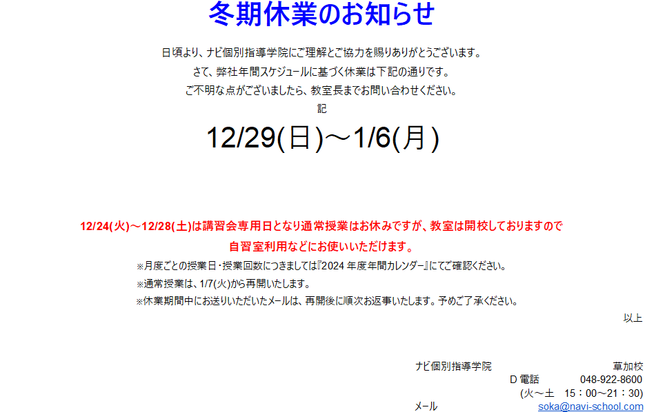 ※12/24㈫~12/28㈯は講習会専用日のため、通常授業はございません。