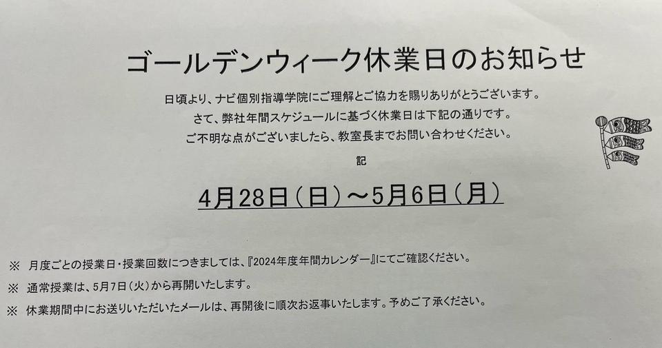 さてナビでは4月28日(日)~5月6日(月)にゴールデンウィーク休業日を設けさせていただいております。