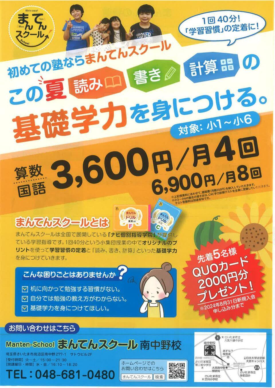 2024年8月31日新規入会申し込み分まで先着5名様に2000円分のQUOカードpayをプレゼント!!□基礎学力を身につけてほしい