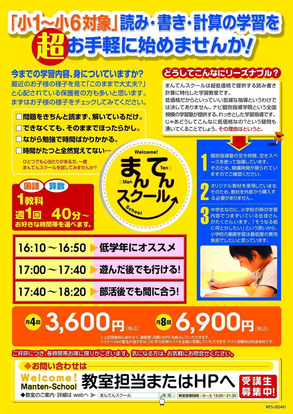 まんてんスクールは小学1年生~6年生を対象とした読み・書き・計算の基礎学力を身につけるためのプリント教材です。