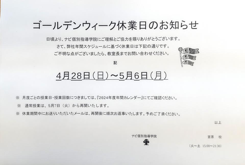 通常授業は5/7(火)~再開しますので、お間違いの無いように