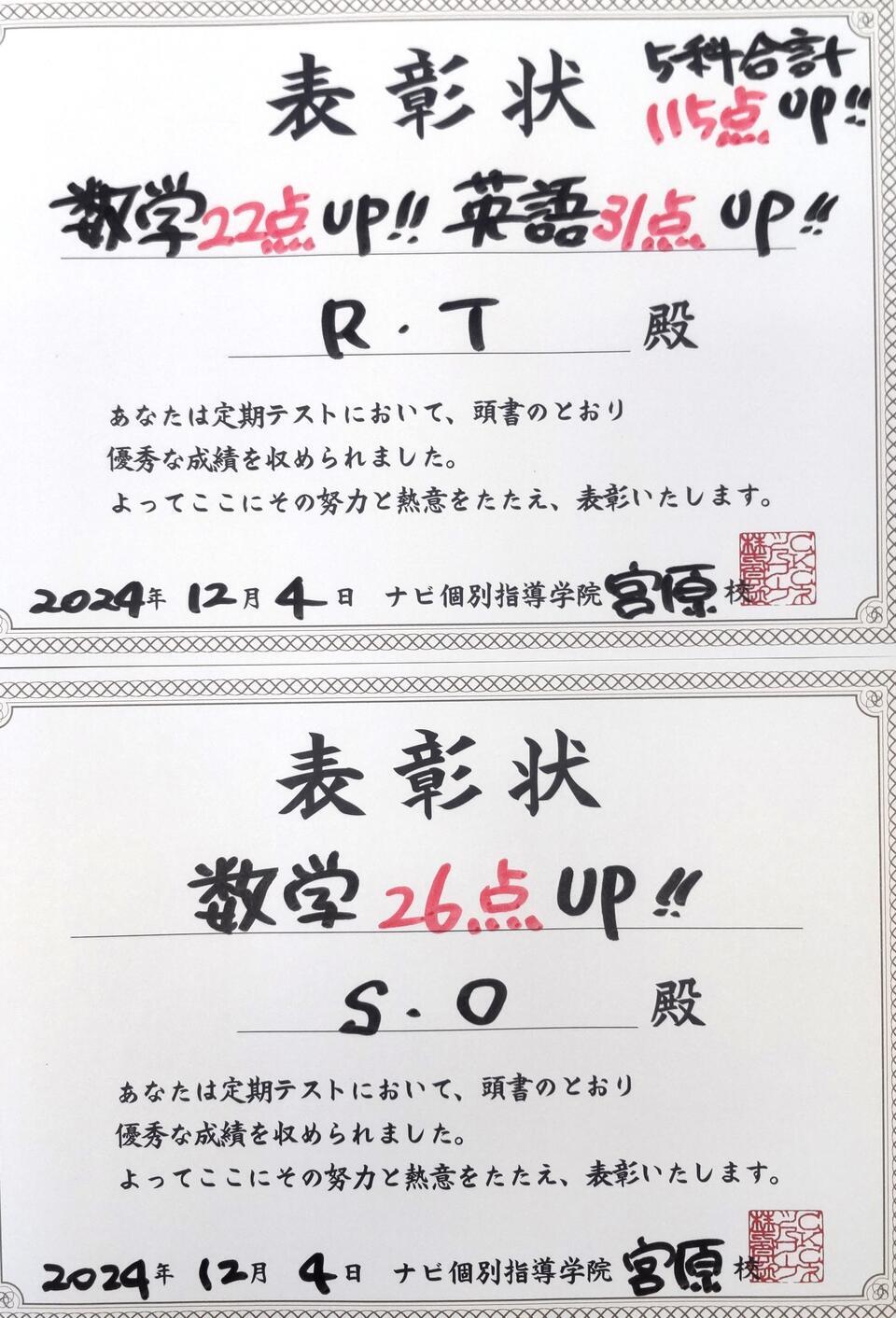 中学2年生 R・Tくん 数学22点UP!英語31点UP!5教科計115点UP!