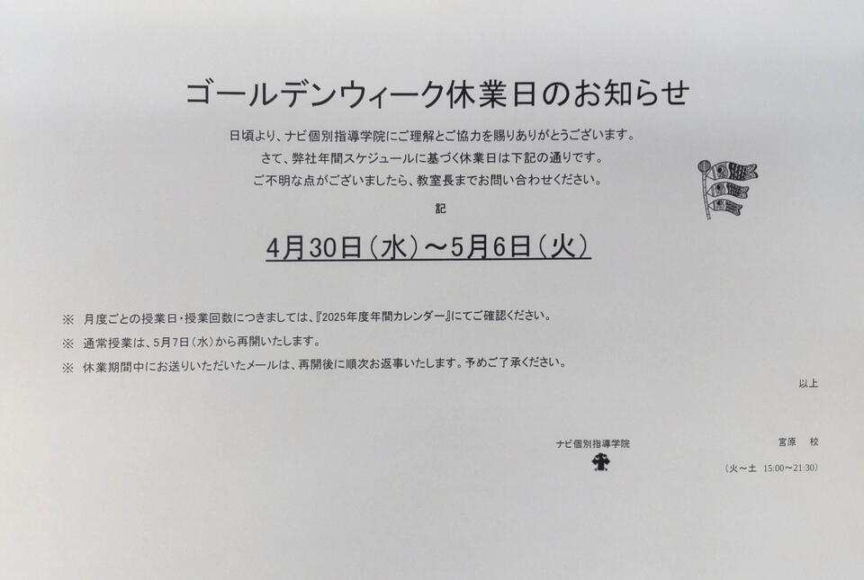本日は「ゴールデンウィーク休業日のお知らせ」です。