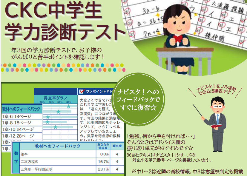 ナビ個別では、年3回の塾内模試「CKC学力診断テスト」を受験して頂いております。