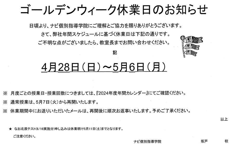 坂戸校は、4/28(日)~5/6(月)がお休みです。