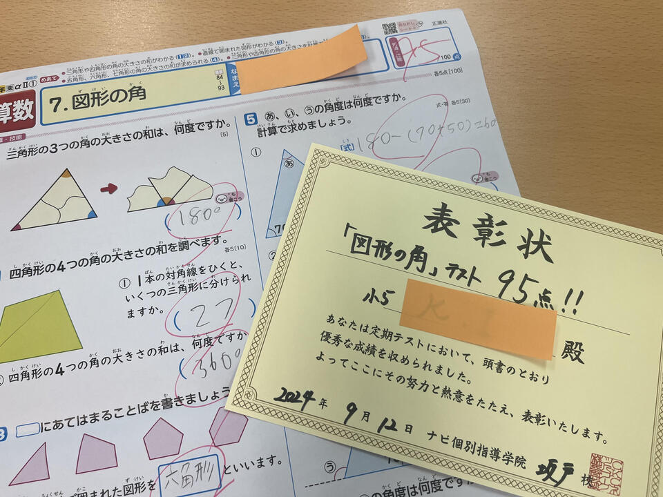 ナビ個別指導学院では、定期テスト・小テストを頑張った生徒に表彰状を作成しています!