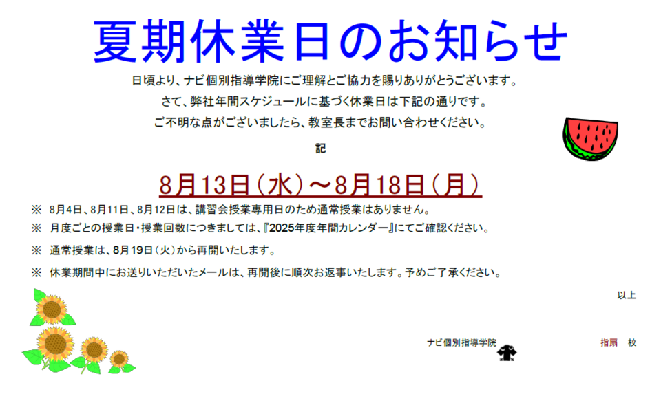 8/13(水)~8/18(月)の期間はお休みとなります。