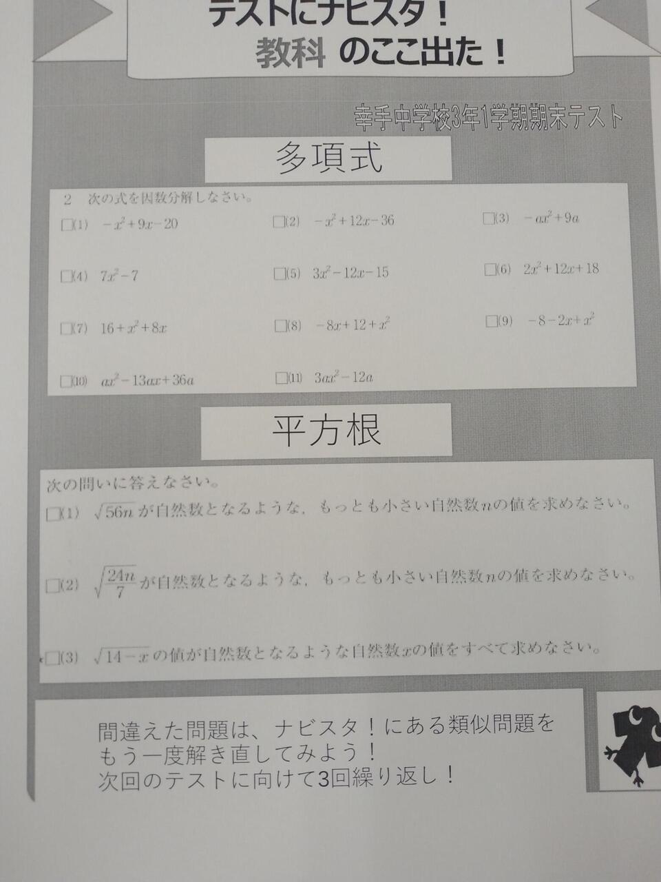 平方根の性質は平方根の中が自然数(整数)になるような文字の値を求める問題です。2乗の形をつくるため素因数分解をするという手順ができていなかったため正答率が低かったように感じます。北辰テスト・入試にも狙われる単元となりますので今のうちに解き方の手順をマスターしましょう!!