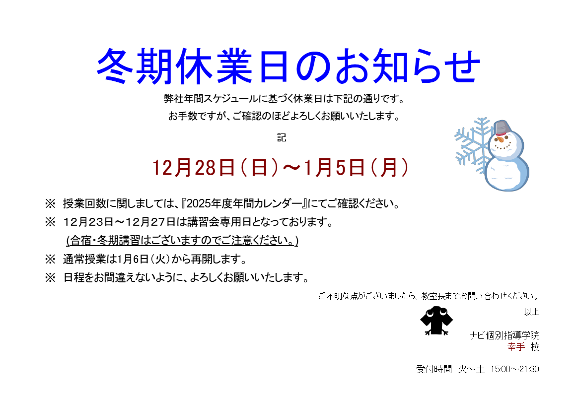 今年のナビ個別指導学院幸手校の冬期休業は以下の通りになります。