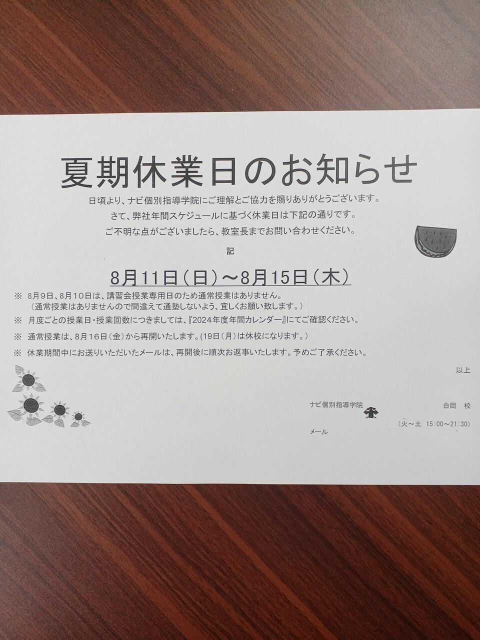 今日は、ナビ個別指導学院白岡校の夏期休業日をお知らせいたします。