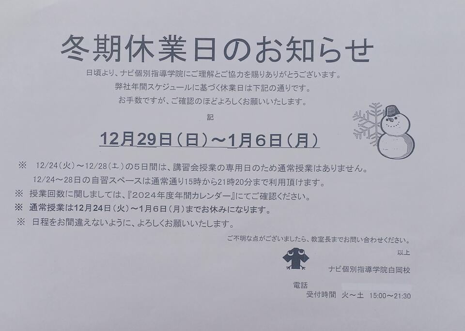 ナビ個別指導学院白岡校の冬期休業日についてお知らせします。