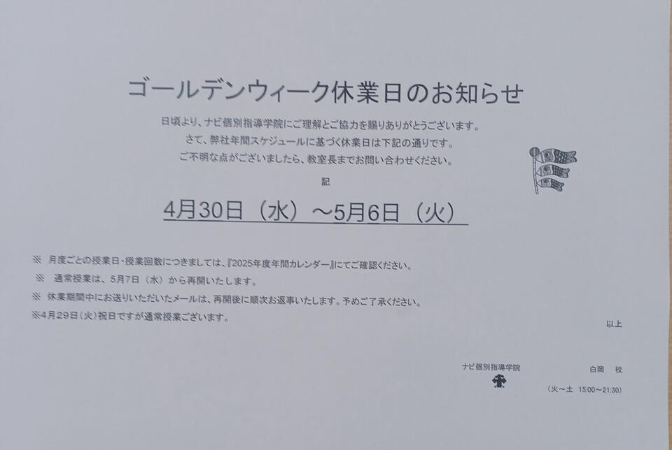 日頃より、ナビ個別指導学院にご理解とご協力を賜りありがとうございます。