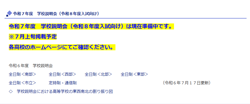 公立高校の説明会等日程は毎年7月上旬になると一覧で発信はありますが、発信されたころには