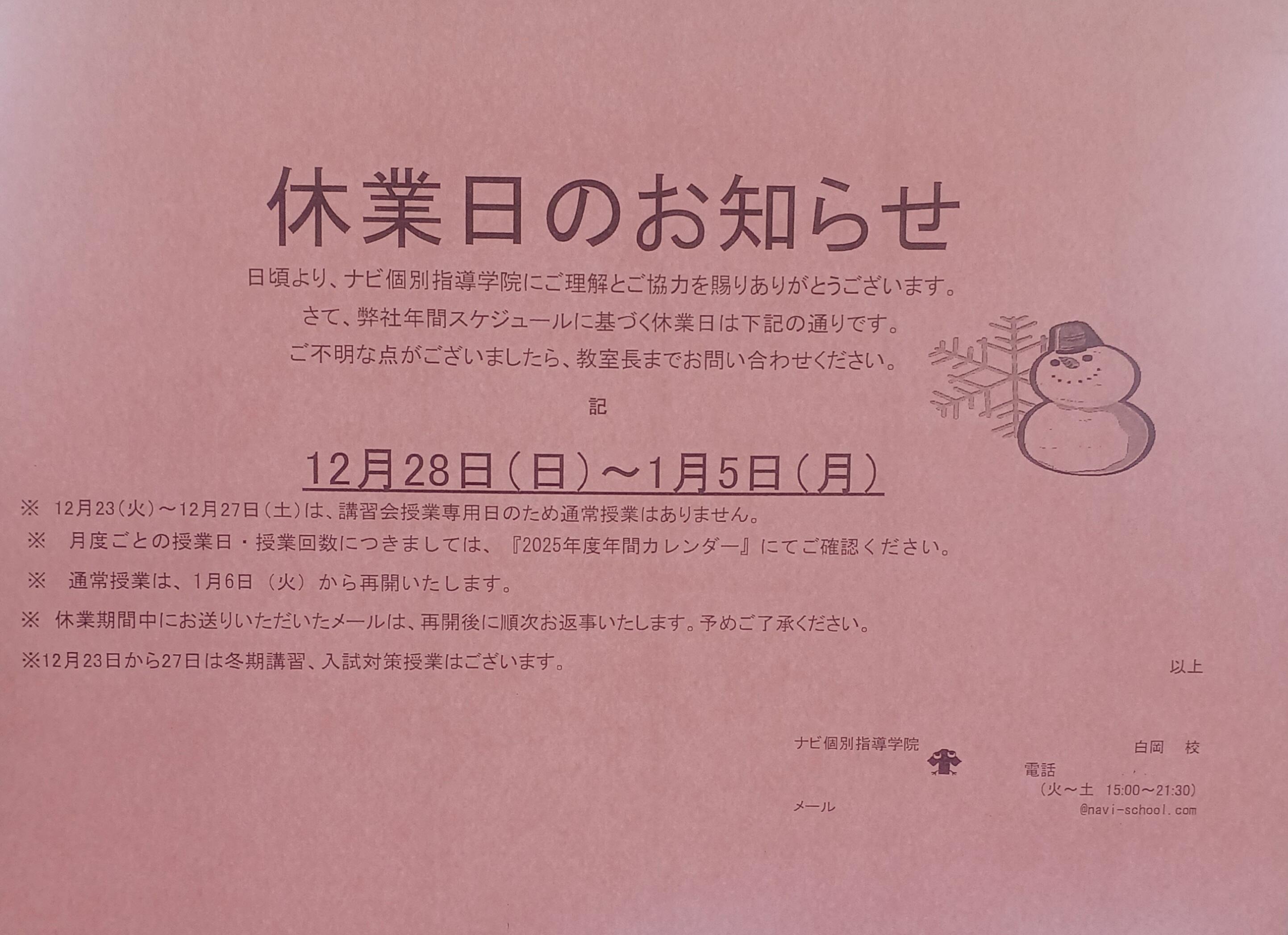 ナビ個別指導学院 白岡校の年末年始における