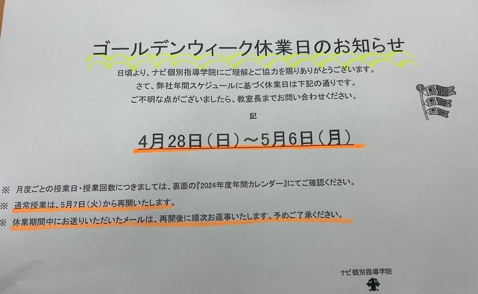 4/28~5/6はGW休業となります。この期間中は通常授業がお休みとなり、自習室等の利用もできなくなります。