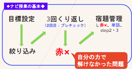 ナビ個別の授業は3周繰り返す中で理解度を深め、出来る問題を増やしていきます。