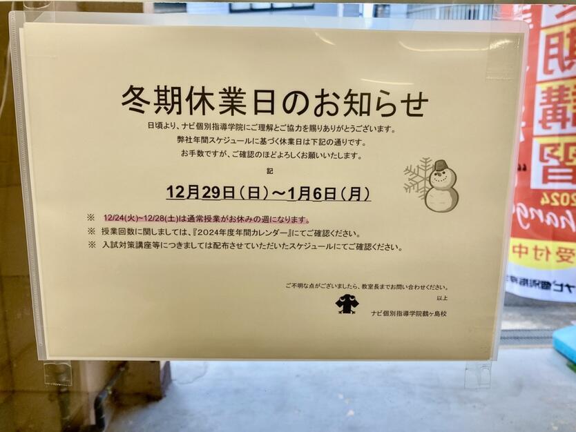 また、12月27日(金)、28日(土)は受験生日帰り合宿専用日のため、18時までの開講となります。