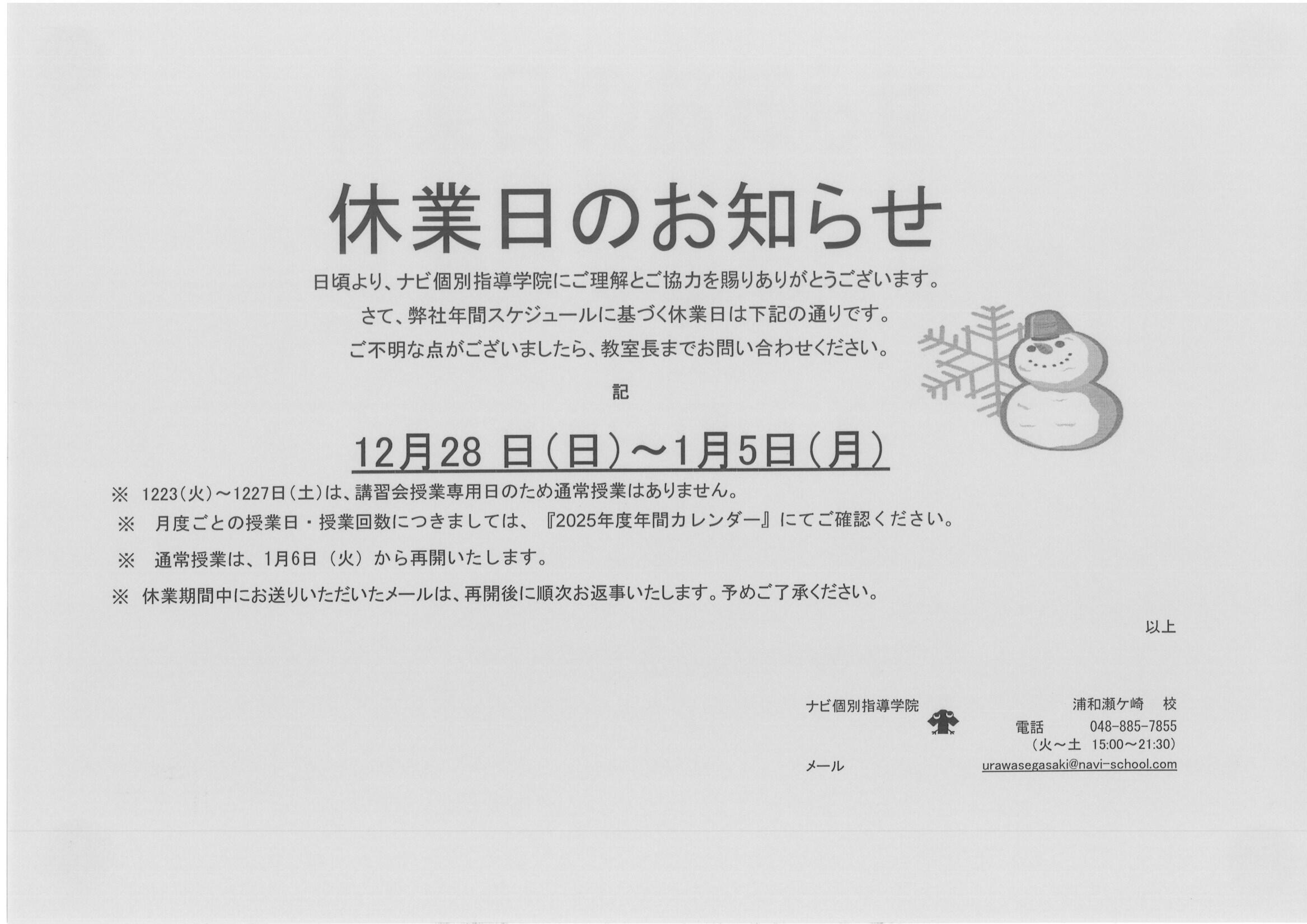 ナビ個別指導学院は、12/28(日)~ 1/5(月)までは