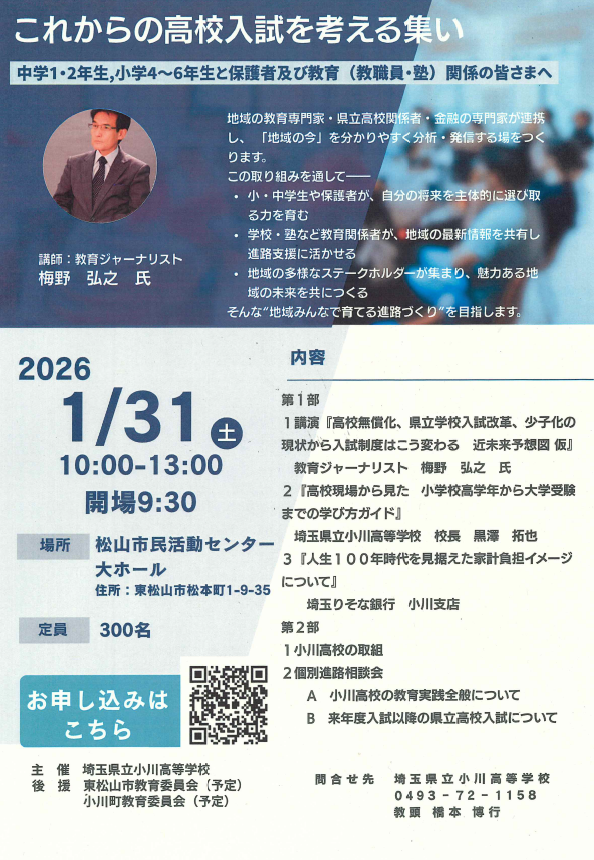 お問合せ先:埼玉県立小川高等学校(0493-72-1158)