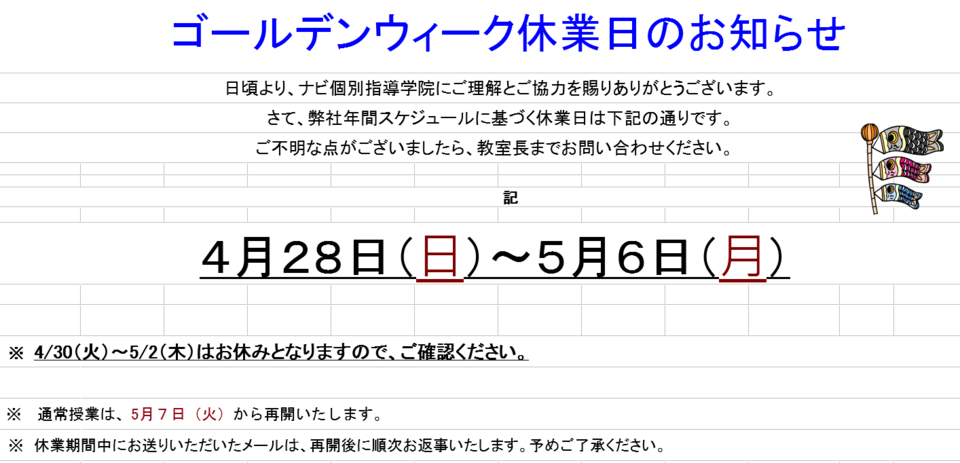 日頃より、ナビ個別指導学院にご理解とご協力を賜りありがとうございます。