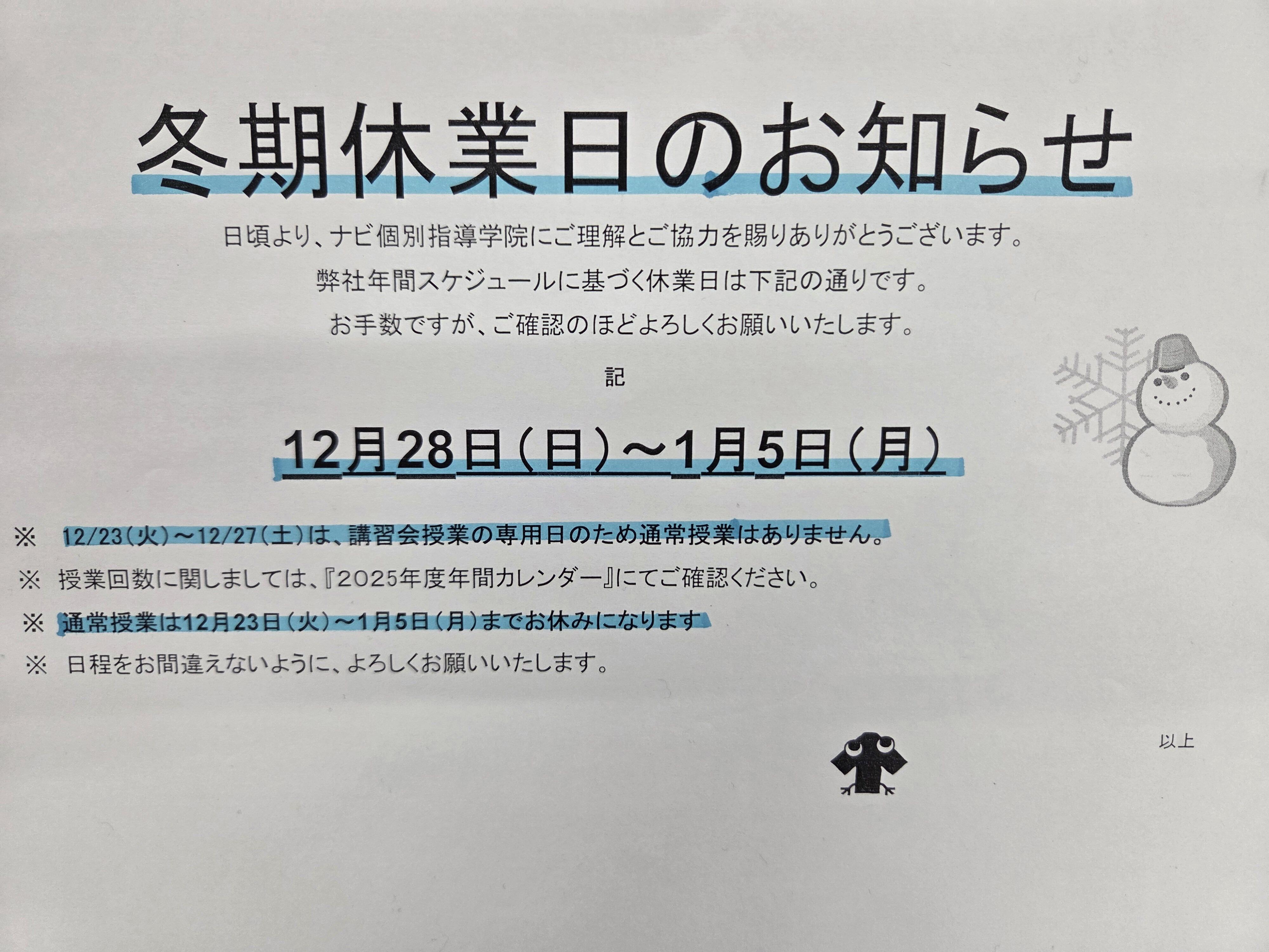 当塾では、12月28日(日)~1月5日(月)まで、冬期休業をいただきます。