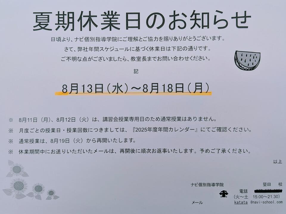 さてナビ個別堅田校の夏休みのお知らせです。
