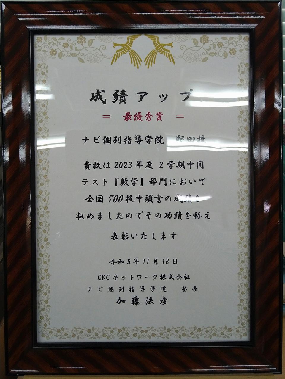 ナビ個別堅田校は全国700校の中から今年度続けて優秀校、最優秀校の表彰を受けております。