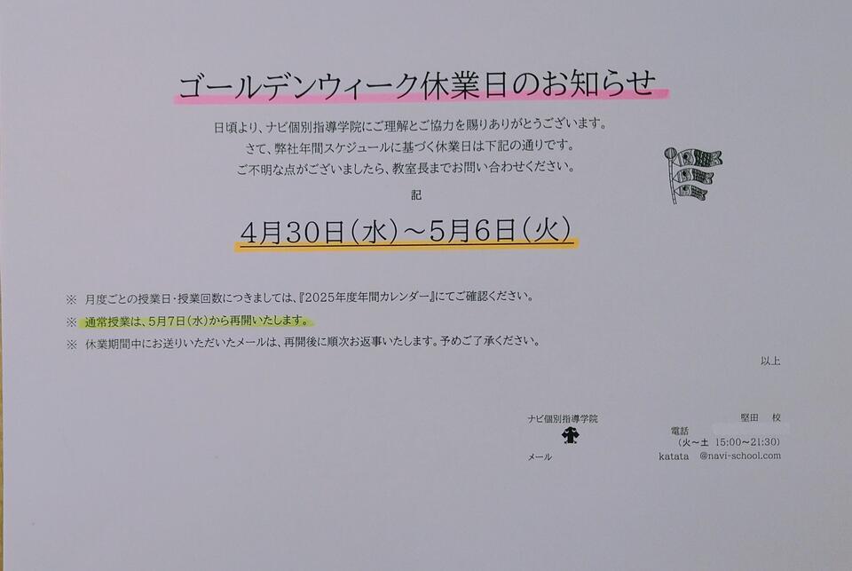 ナビ個別 堅田校は明日4/30(水)より5/6(火)迄お休みとなります。