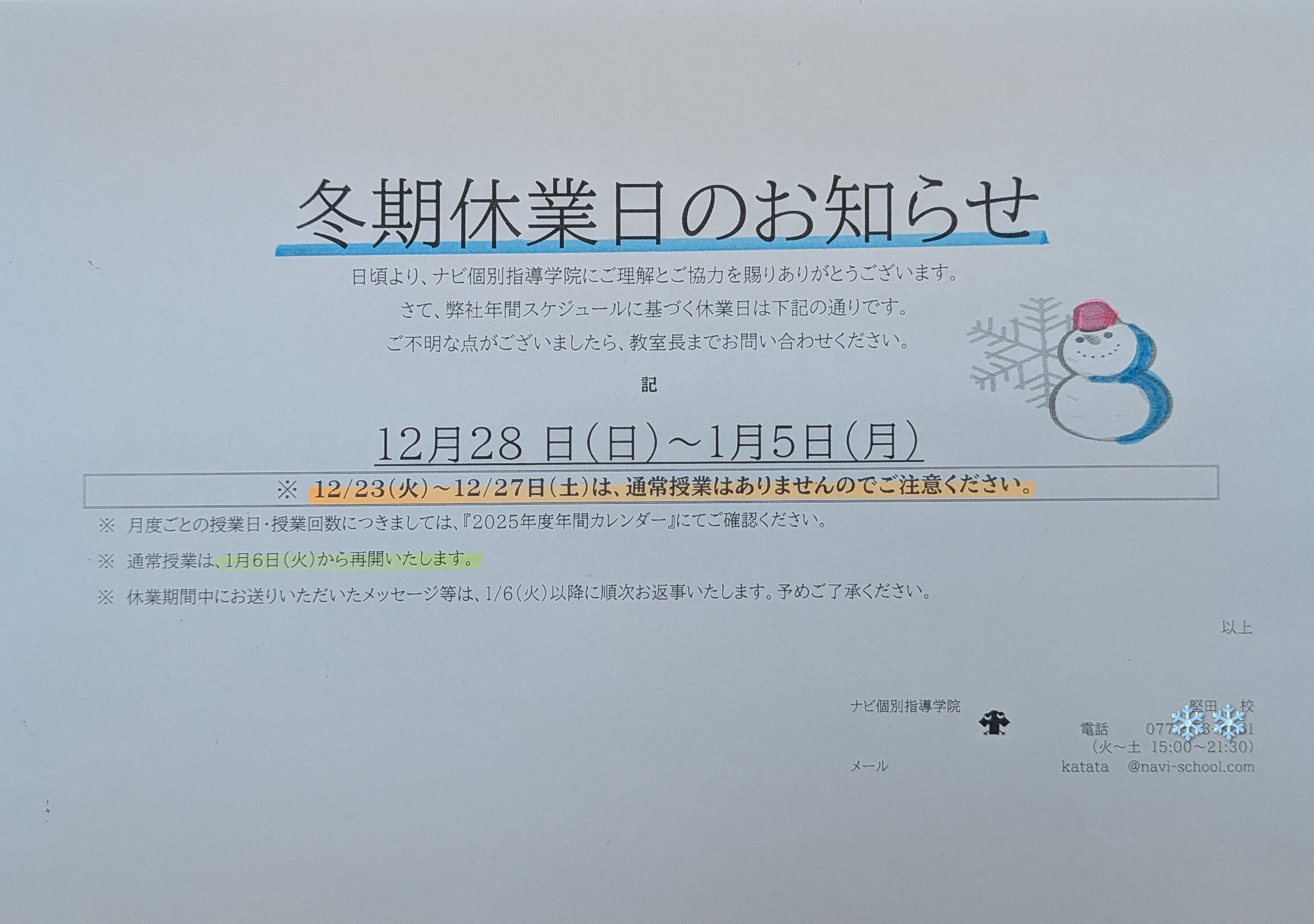 ナビ個別堅田校は今週は講習のみ来週より冬期休業となります。