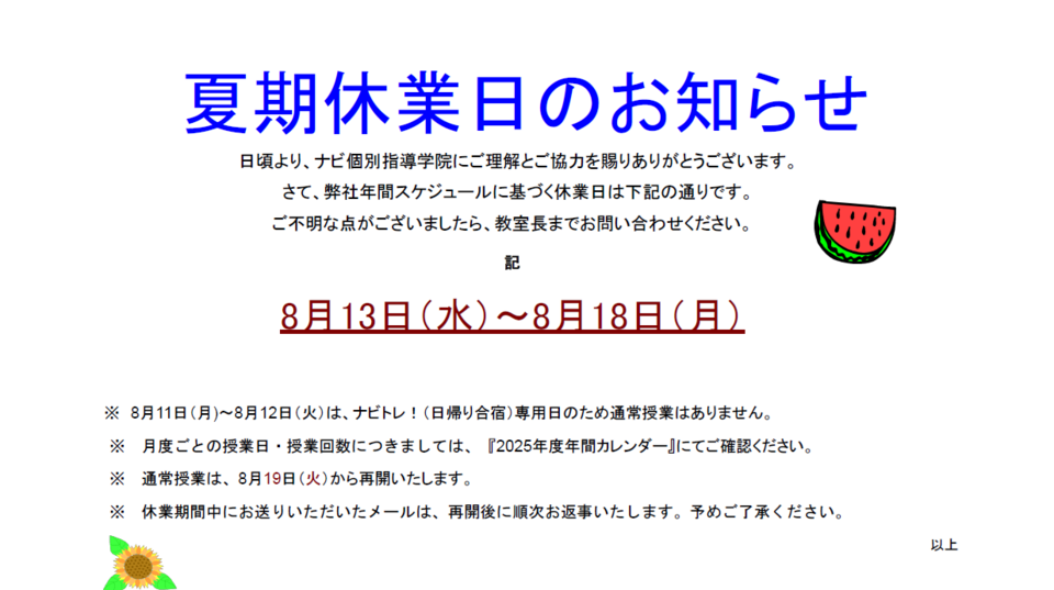 休業明けからもナビ個別指導学院 甲西校をよろしくお願いいたします。