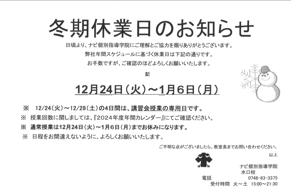 また、12/24(火)~12/28(土)は講習会専用日となっており