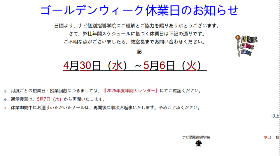 塾生様につきましてはスケジュールを確認の上、お間違えの無いよう何卒よろしくお願い致します。