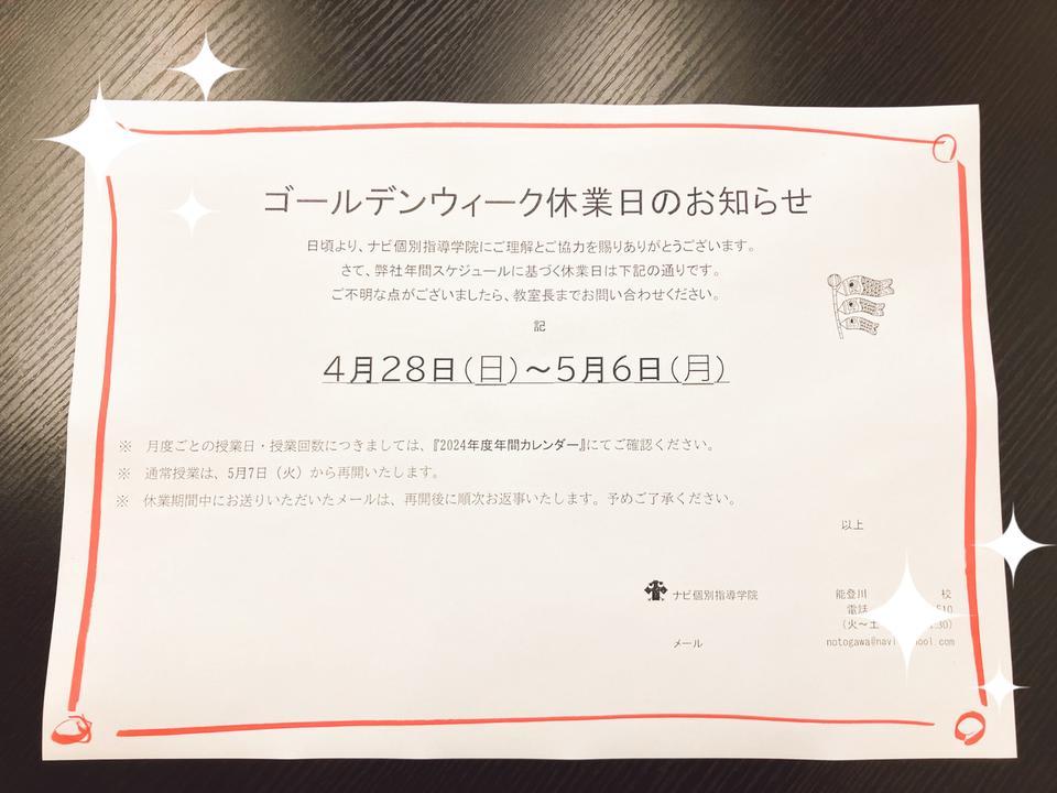 ゴールデンウィークに伴い休講期間とさせて頂きます。