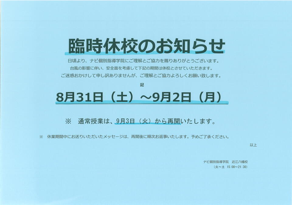 ナビ個別指導学院近江八幡校は臨時休校とさせていただきます。