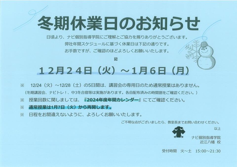 新年の運営再開は、1/7(火)からとなります。