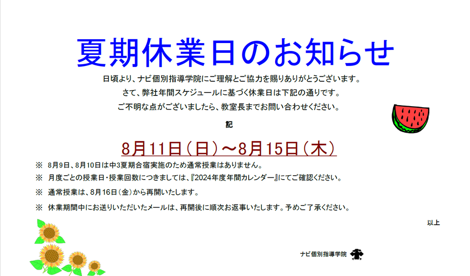 ナビ個別指導学院 栗東校は夏期休業を頂きます。