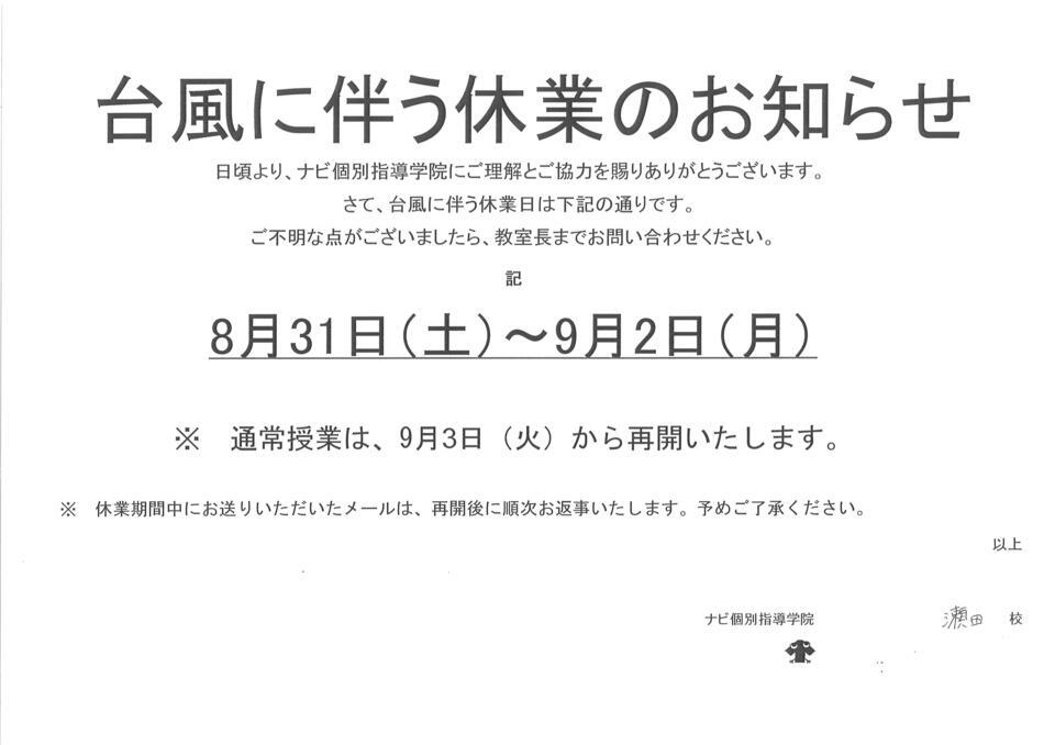 8/31(土)は台風10号接近に伴う悪天候のため、臨時休校とさせていただきました。