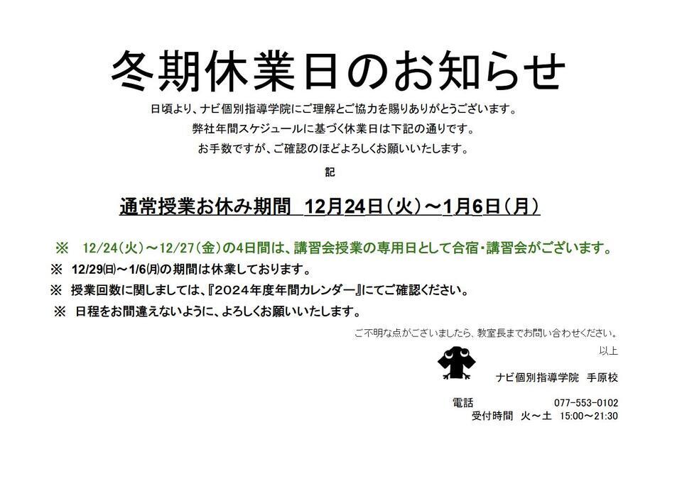通常授業お休み期間 12月24日(火)~1月6日(月)