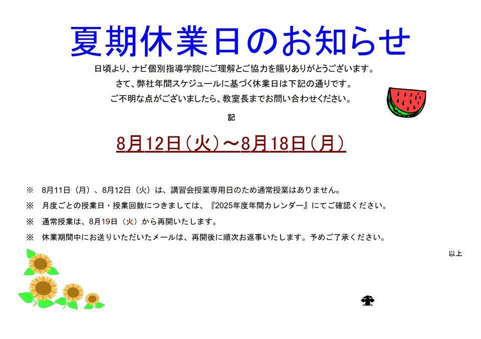 当塾は、8/13(水)~8/18(月)まで夏期休業となっております。
