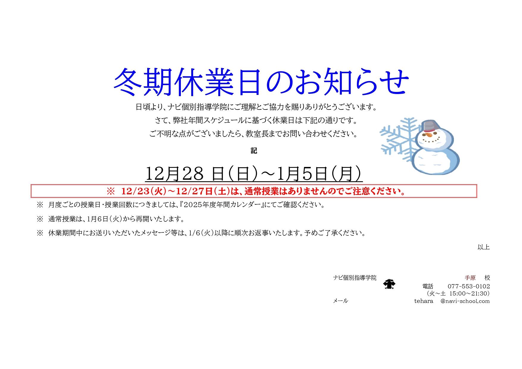 ナビ個別手原校は今週は講習のみ、来週より冬期休業となります。