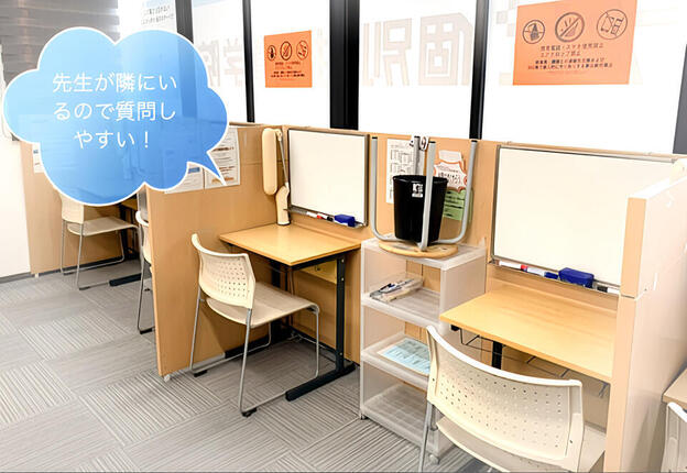 ナビ個別指導学院の授業は、個別の席ごとに設置された自分専用のホワイトボードで解き方や考え方を一緒に確認、それから生徒が問題を解くという「個別授業」スタイルです。