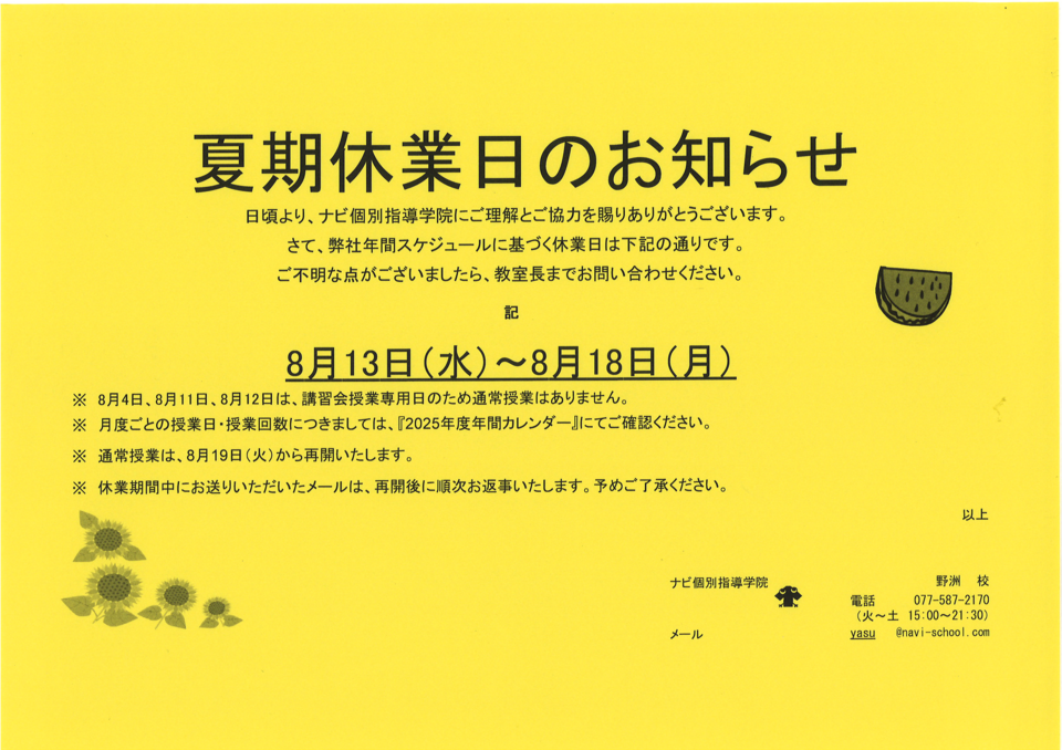 ここからはお知らせですが、ナビ個別は8/13より夏期休業に入ります。