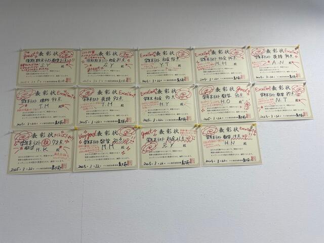 こういった生徒さんには表彰状を手渡しと、教室内の掲示を行っております。