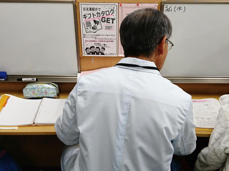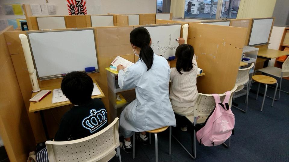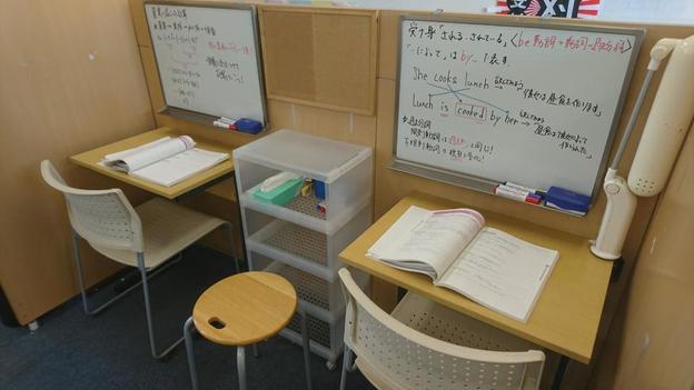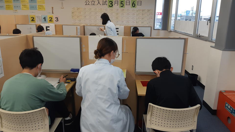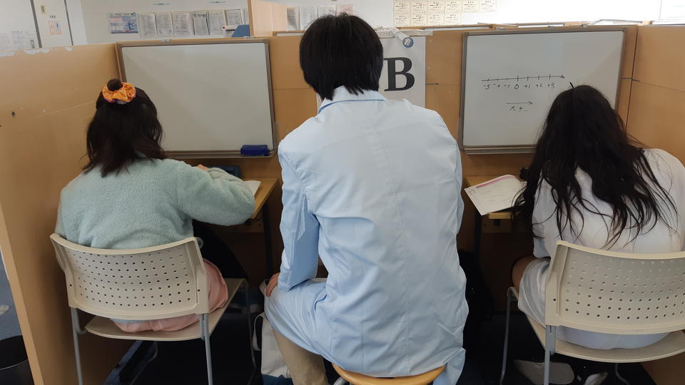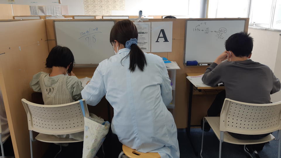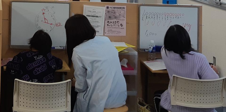 ナビ個別指導学院の授業は、個別の席ごとに設置された自分専用のホワイトボードで解き方や考え方を一緒に確認、それから生徒が問題を解くという「個別授業」スタイルです。